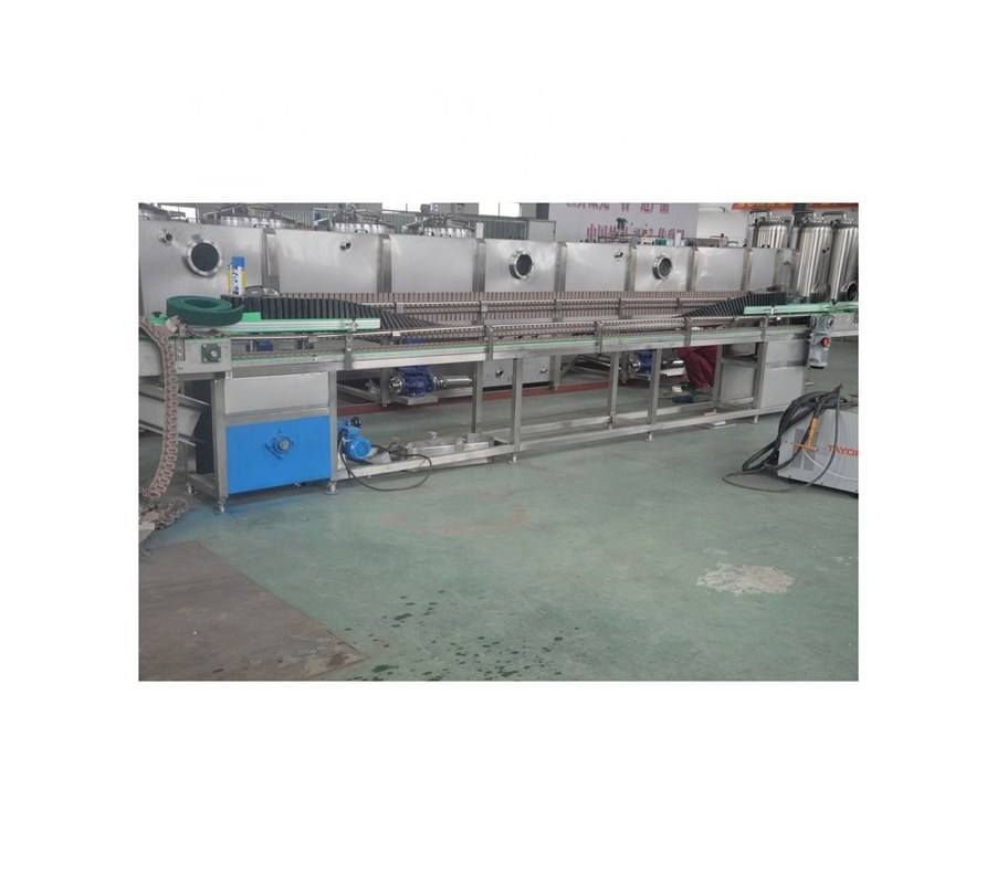 2製品が満たされ蓋が閉ざされた後,ボトルを自動で90°逆転させ,機械で床器具を入れます.そしてボトルの内部は,材料の高温で無菌化され,その後ボトルは垂直に置かれ,シャワーと冷却器に入ります.